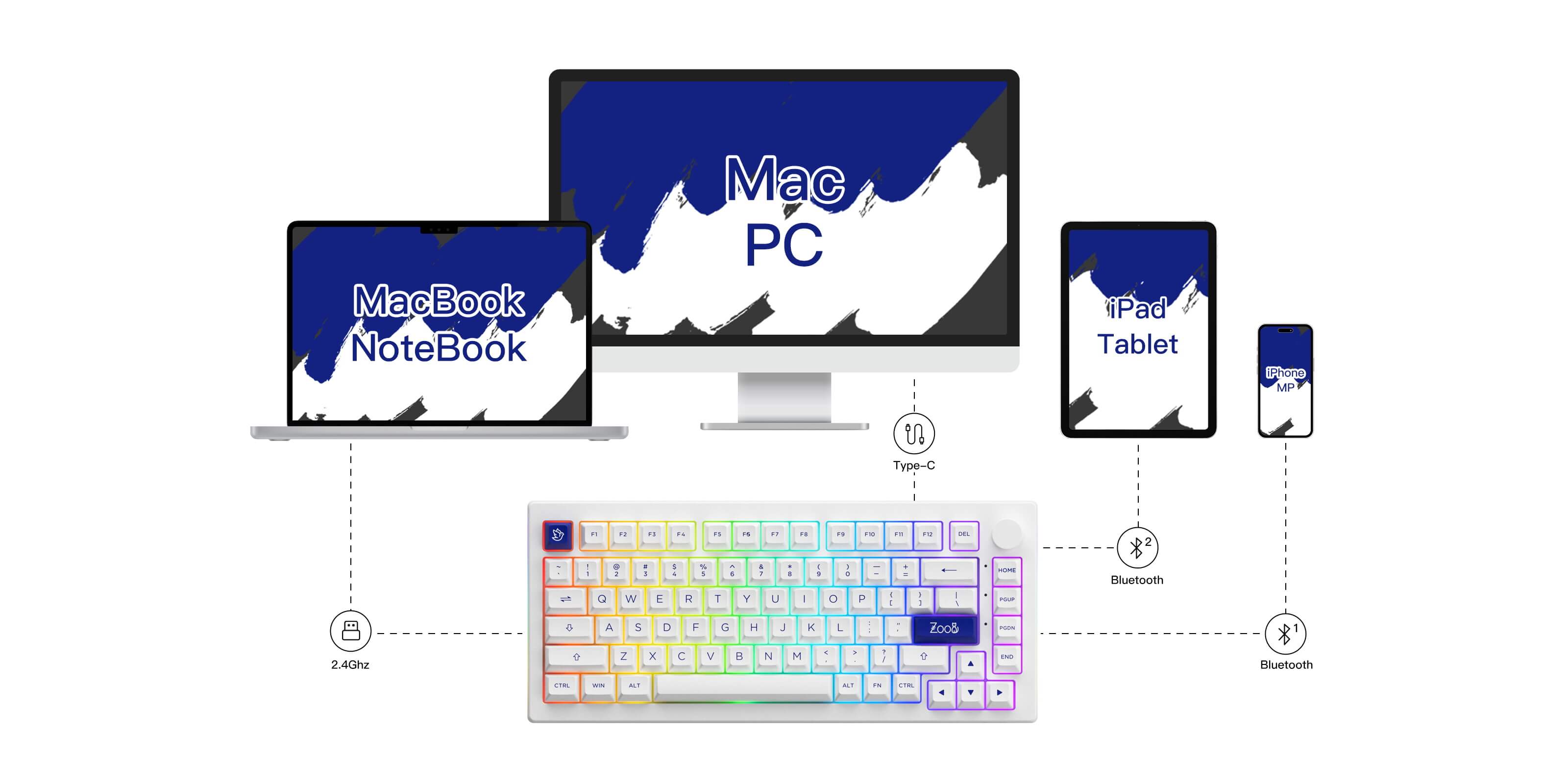 5075B Plus wird mit einem Beken Plus-Chip mit Tri-Modes-Lösung (2,4 G/Bluetooth/Typ C) geliefert. Darüber hinaus werden bis zu 3 gespeicherte Bluetooth-Geräte unterstützt. Kompatibel mit Windows / Mac / Android.