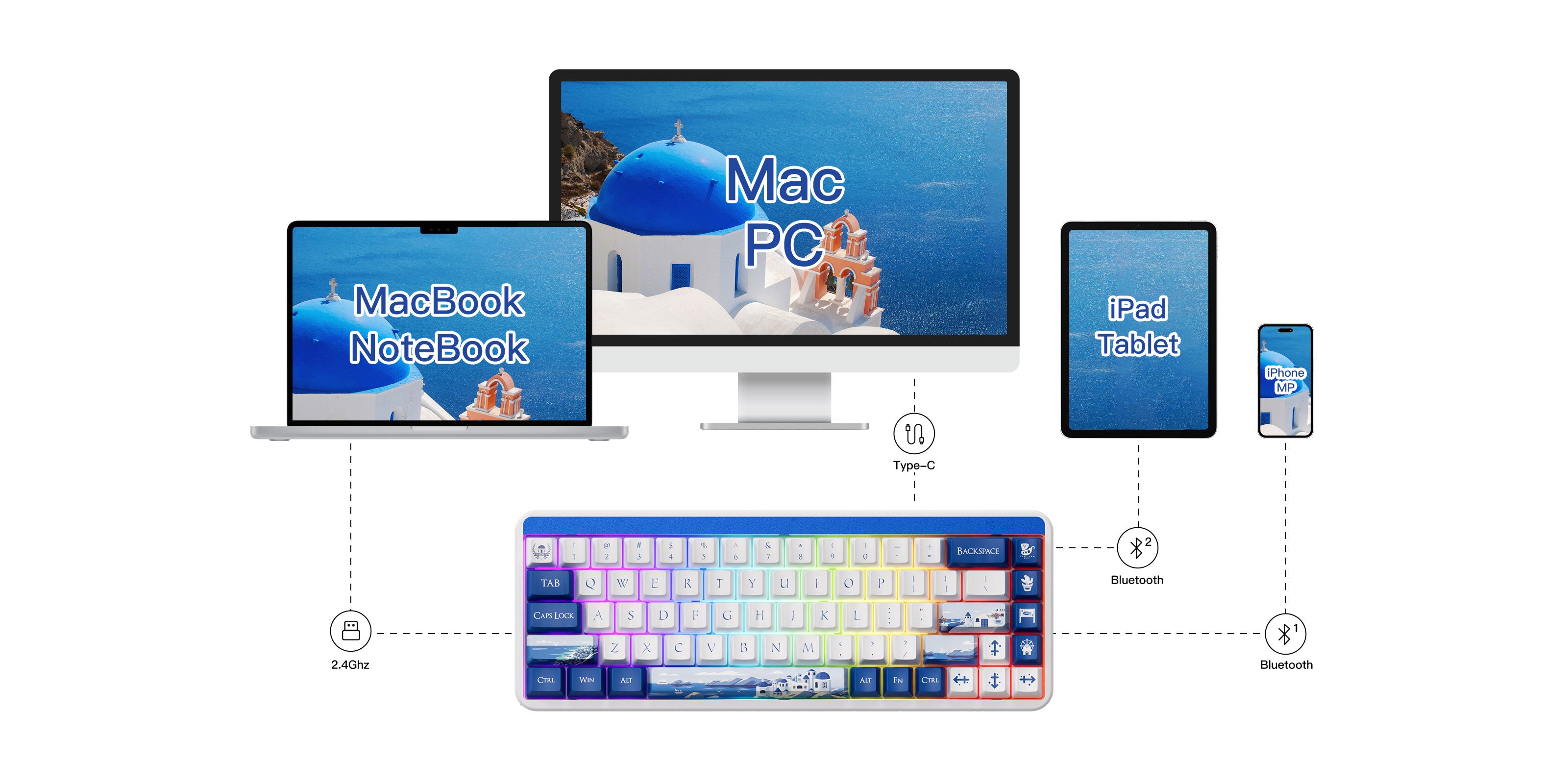 Die Aluminiumtastatur JIN01 Santorini kann über Bluetooth 5.0, Multi-Host 2,4 GHz (mit einem Empfänger) und kabelgebundenen Typ-C-Modus mit einfachem Umschalten mit mehreren Geräten verbunden werden.