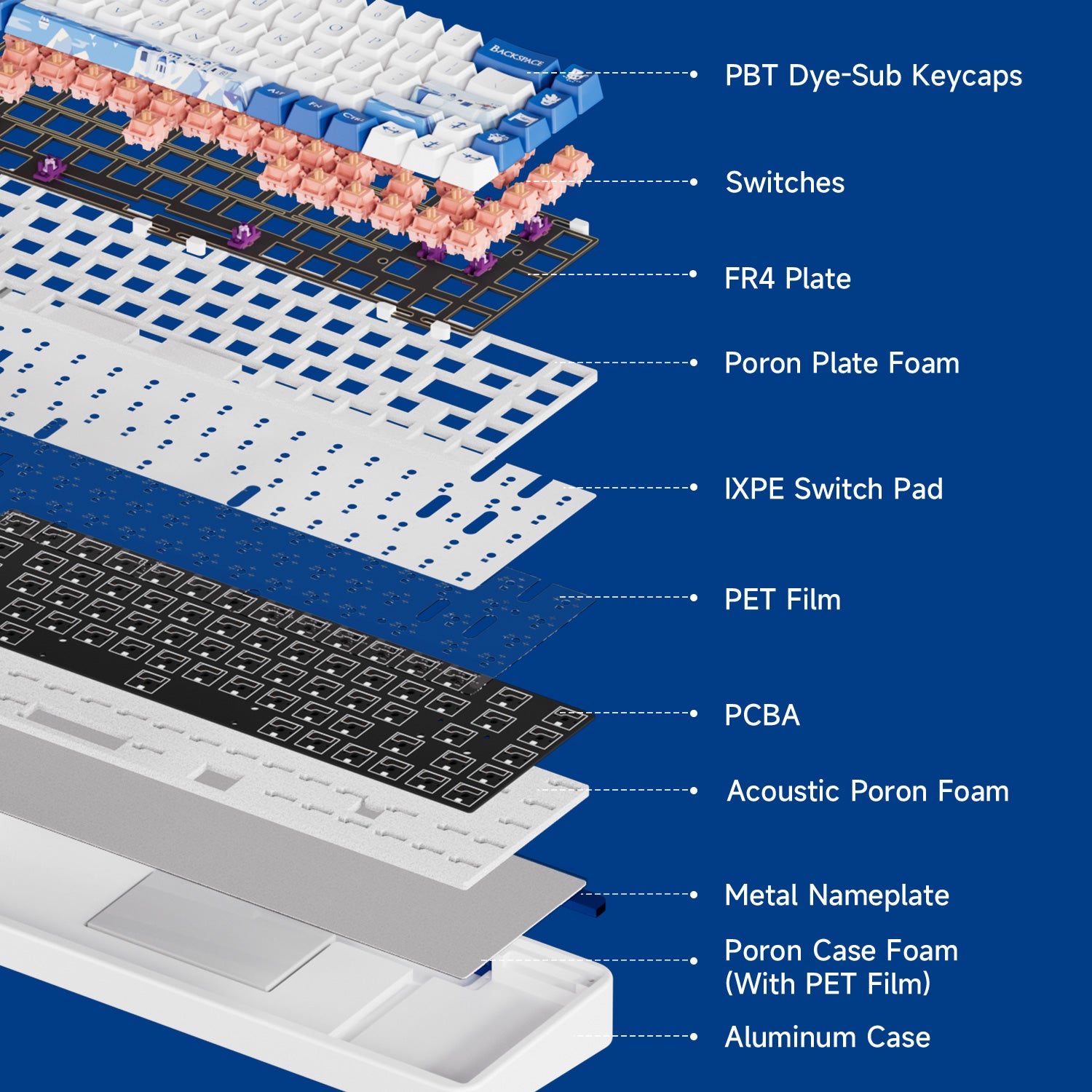 Die mechanische Tastatur Akko JIN01 verfügt über ein Upgrade des 5-lagigen Geräuschreduzierungssystems. Mit einer zusätzlichen PET-Schicht und 3,0 mm Poron-Schaumstoff (mit Aussparungen für die Buchsen) zeichnet sie sich durch hervorragende Schalldämmung und Geräuschminimierung aus.