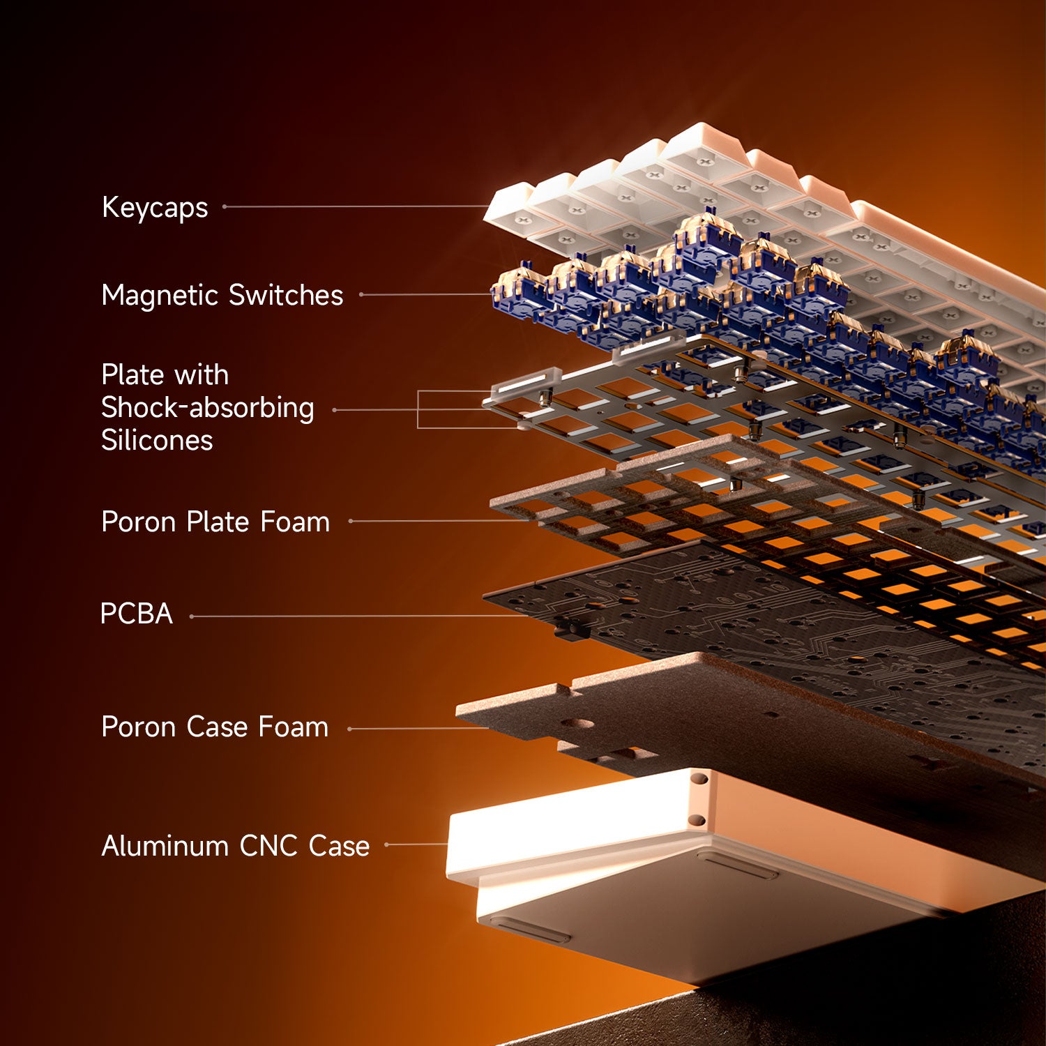 These magnetic switches allow users to adjust every key’s actuation point from 0.1mm to 3.4mm, which offers different kinds of pressing for gaming or typing.