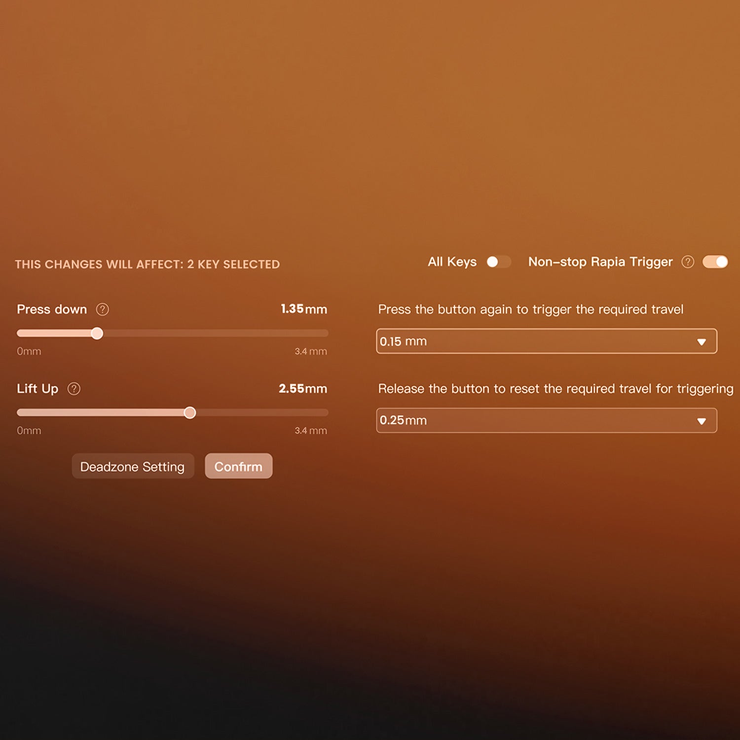 Rapid Trigger dynamically changes the keys’ actuation and deactivation points. Through the Akko Driver, users can choose “All Buttons” or “Per Button” customization modes, as well as activate “Non-stop Rapid Trigger” for near-instant key response. This gives FPS gamers a competitive edge in fast-paced gameplay.