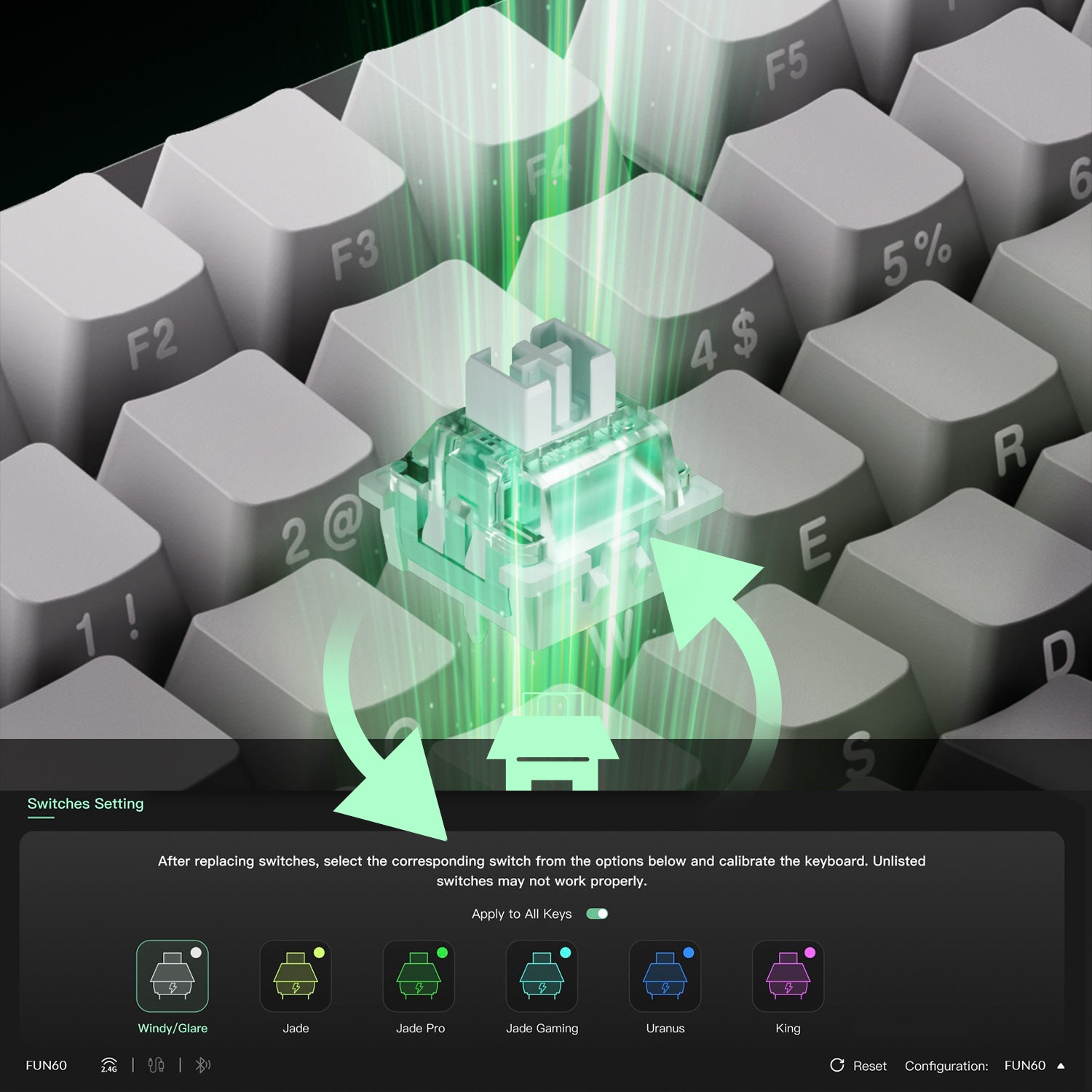 MonsGeek M1 V5 VIA Benutzerdefinierte mechanische Tastatur ist mit fünf Magnetschaltern von Drittanbietern kompatibel. Nutzer können den passenden Schalter aus der MonsGeek-Treiberliste auswählen und die Tastatur nach dem Austausch einfach kalibrieren. Auch das Kombinieren verschiedener Tasten ist möglich.