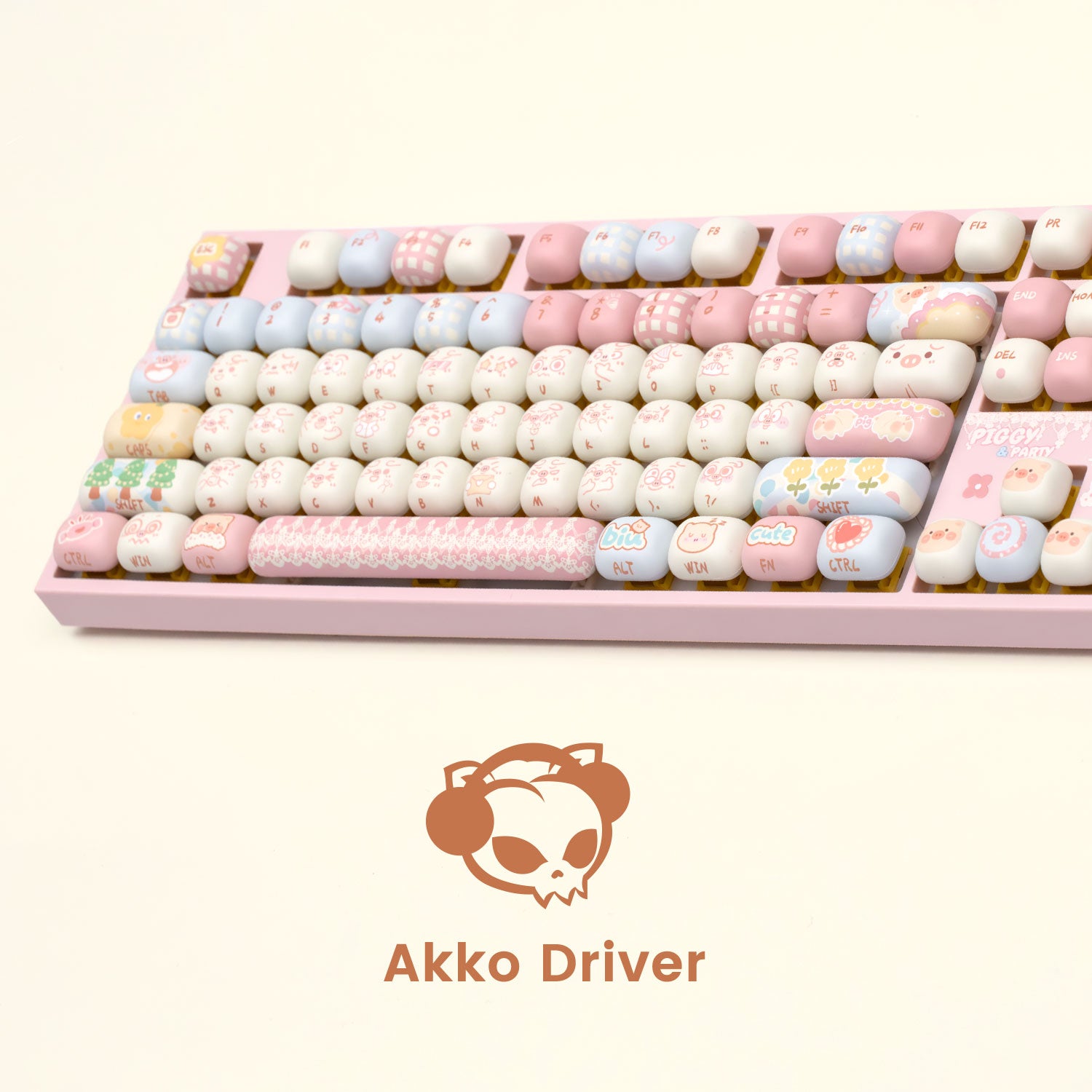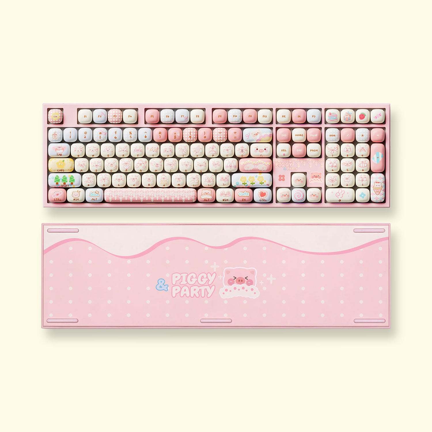 A flat back panel showcases Piggy Party theme artwork, perfectly matched with themed keycaps for a cohesive visual experience
