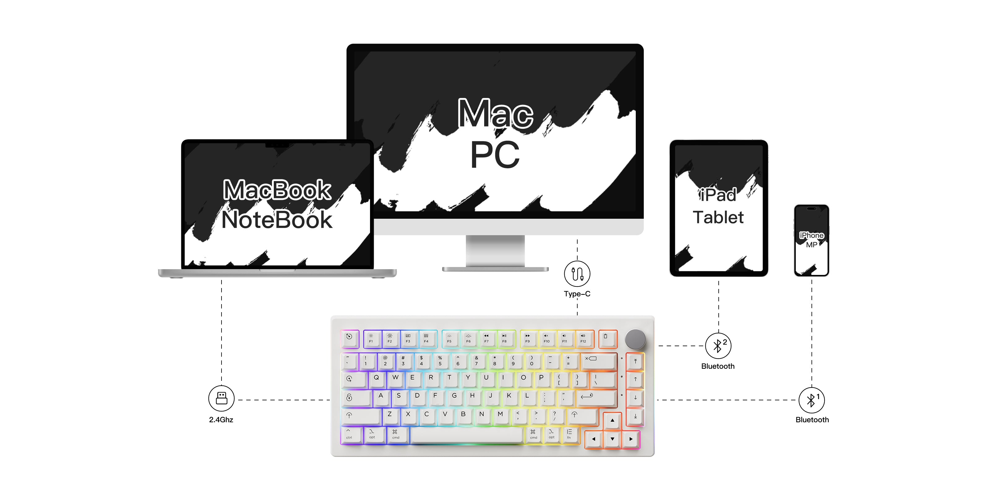Compatible avec macOS + rétroéclairage LED RVB + échangeable à chaud + Bluetooth 5.0 + 2,4 G sans fil + filaire (mode USB-C) tout en un !
