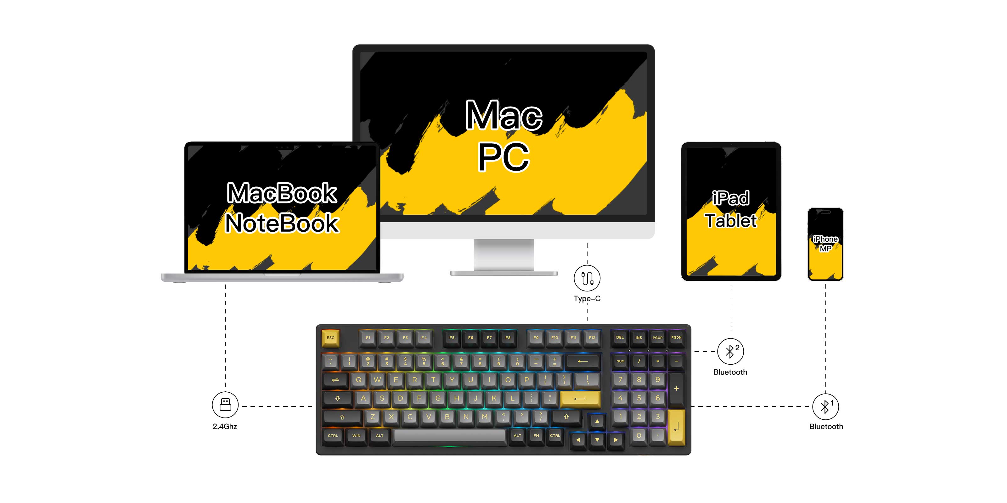Rétroéclairage LED RVB + remplaçable à chaud + Bluetooth 5.0 + sans fil 2,4 G + filaire (mode USB-C) tout en un !