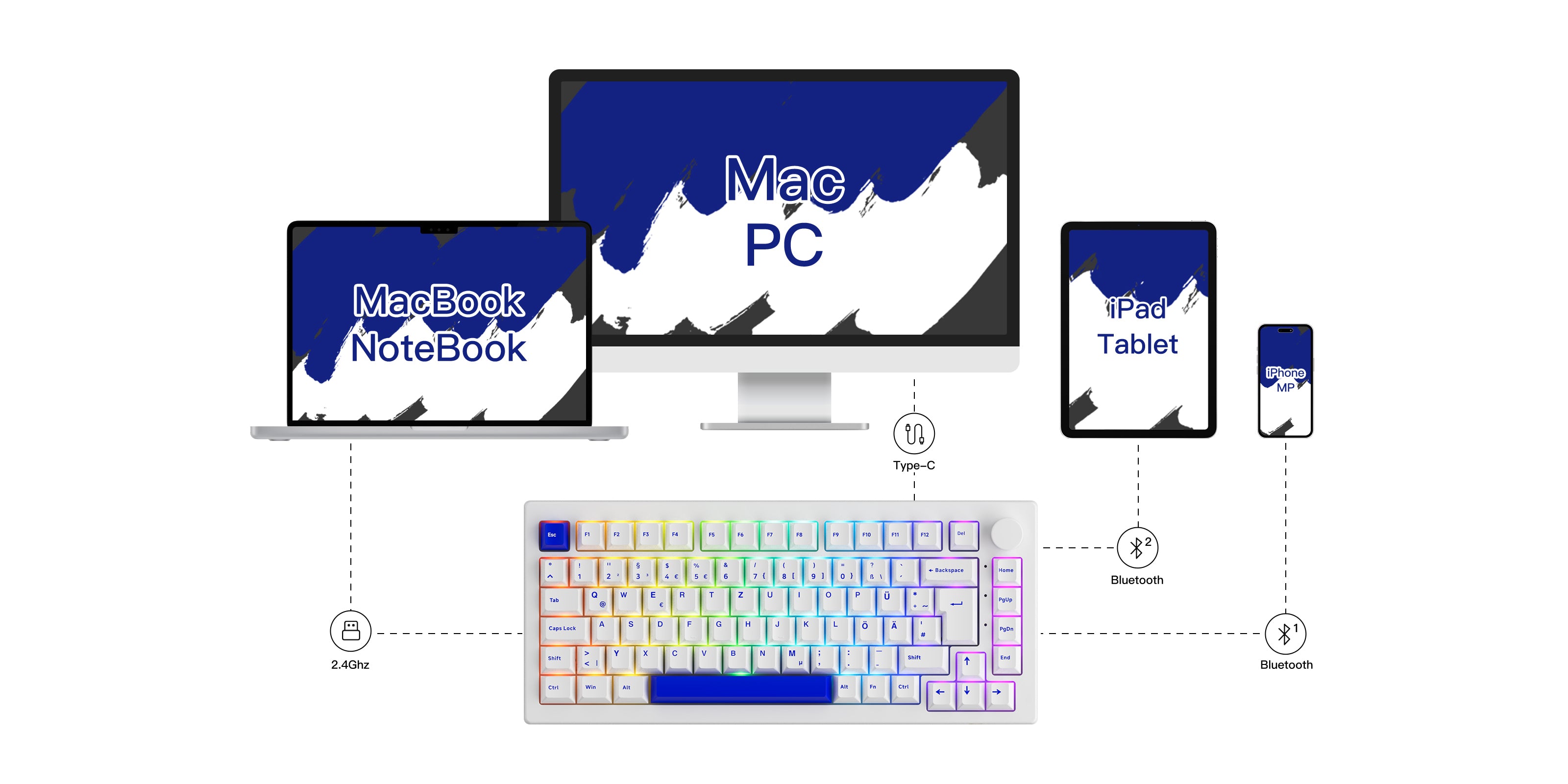 ISO-DE + Rétroéclairage LED RVB + Échangeable à chaud + Bluetooth 5.0 + Sans fil 2,4G + Filaire (mode USB-C) Tout en un !