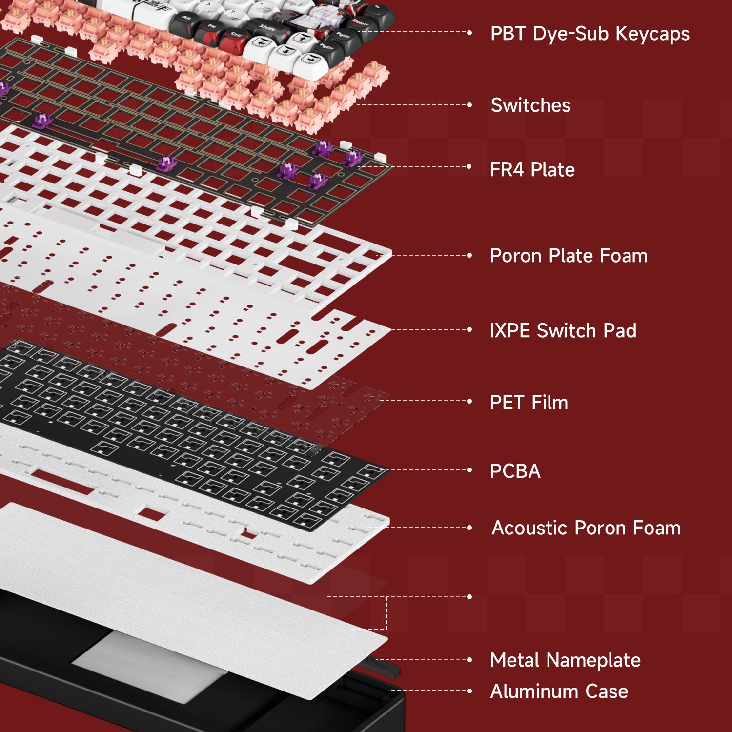 Le clavier mécanique Akko JIN01 bénéficie d'un système de réduction du bruit à 5 couches. Grâce à une couche supplémentaire en PET et à une mousse Poron de 3,0 mm (avec découpes pour les prises), il excelle dans le blocage du son et la réduction du bruit.