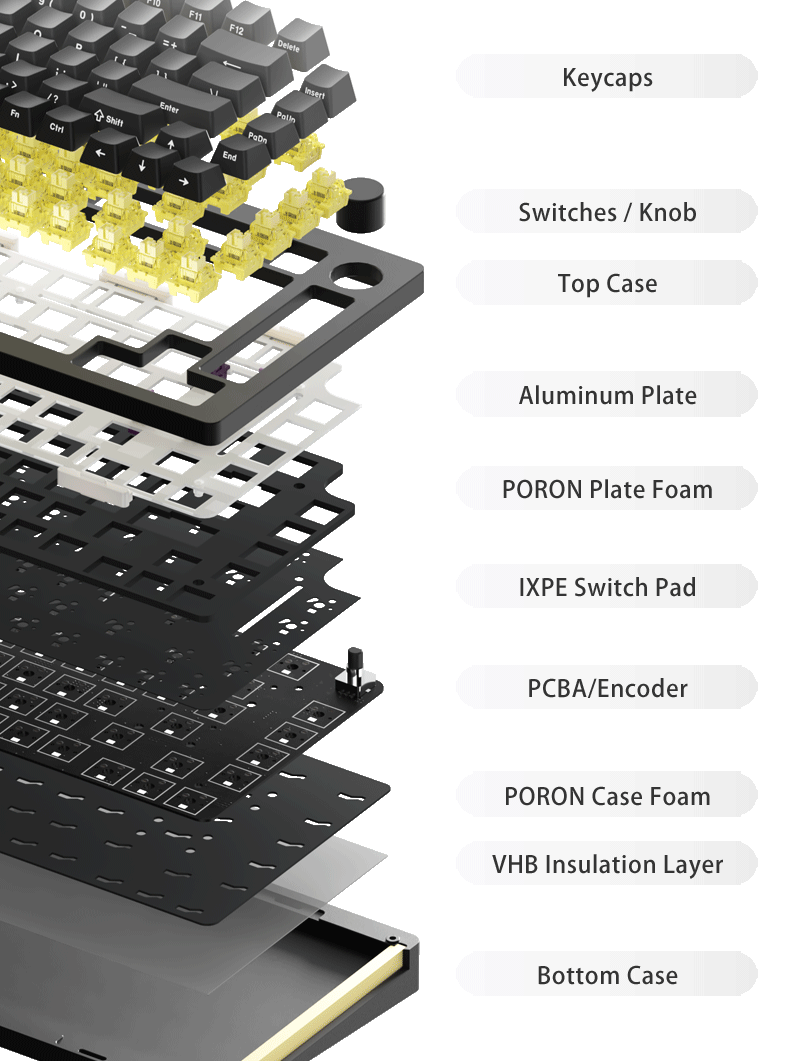 Le clavier pré-construit M1 HE est équipé d'une plaque de mousse PORON, réduisant efficacement le bruit généré par les interrupteurs à touches, garantissant une expérience sonore tactile plus pure et plus confortable pour le clavier.