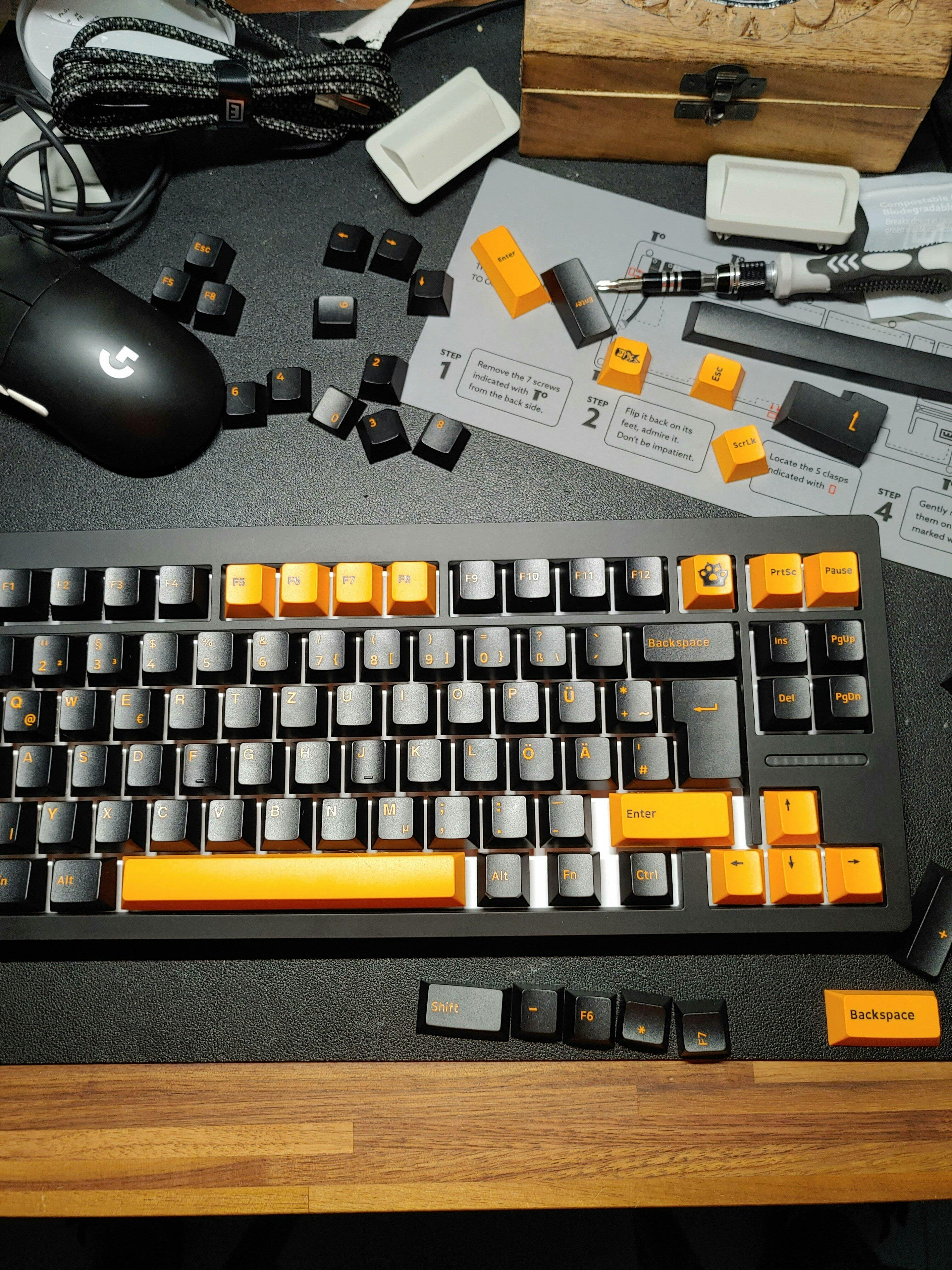 Ce Ensemble de touches DE ISO orange sur noir (119 touches) est livré dans un bocal compact, facile à ranger, organiser et transporter. Gardez vos touches propres, à l'abri de la poussière et prêtes à voyager, que vous les mettiez à niveau à la maison ou que vous les personnalisiez en déplacement.