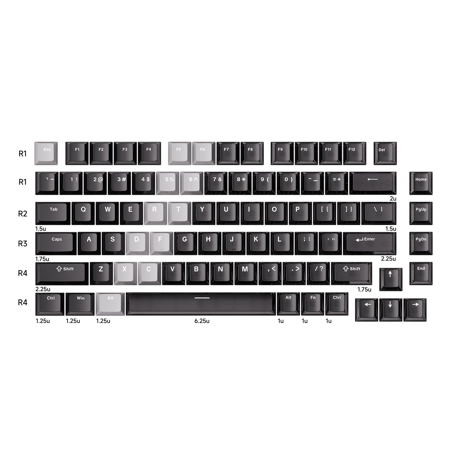 - The image displays keycaps in various unit widths (e.g., 1u, 1.25u, 1.5u, 1.75u, 2u, 2.25u, 2.75u, and 6.25u).