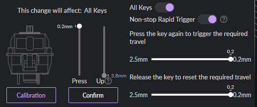 When you set up rapid trigger, you can set the subsequent key press and release from 0.2mm~2.5mm with an increment of 0.1mm.