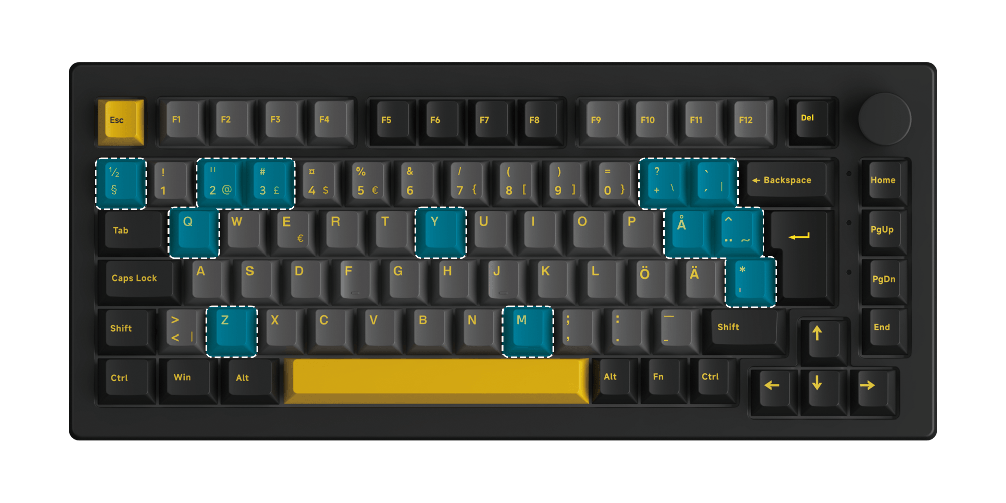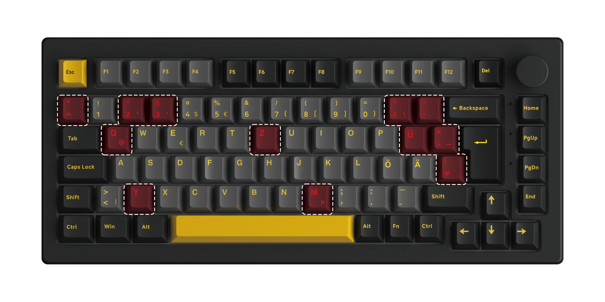 1. Remove the highlighted keycaps from your keyboard according to the picture above, using the provided keycap puller.