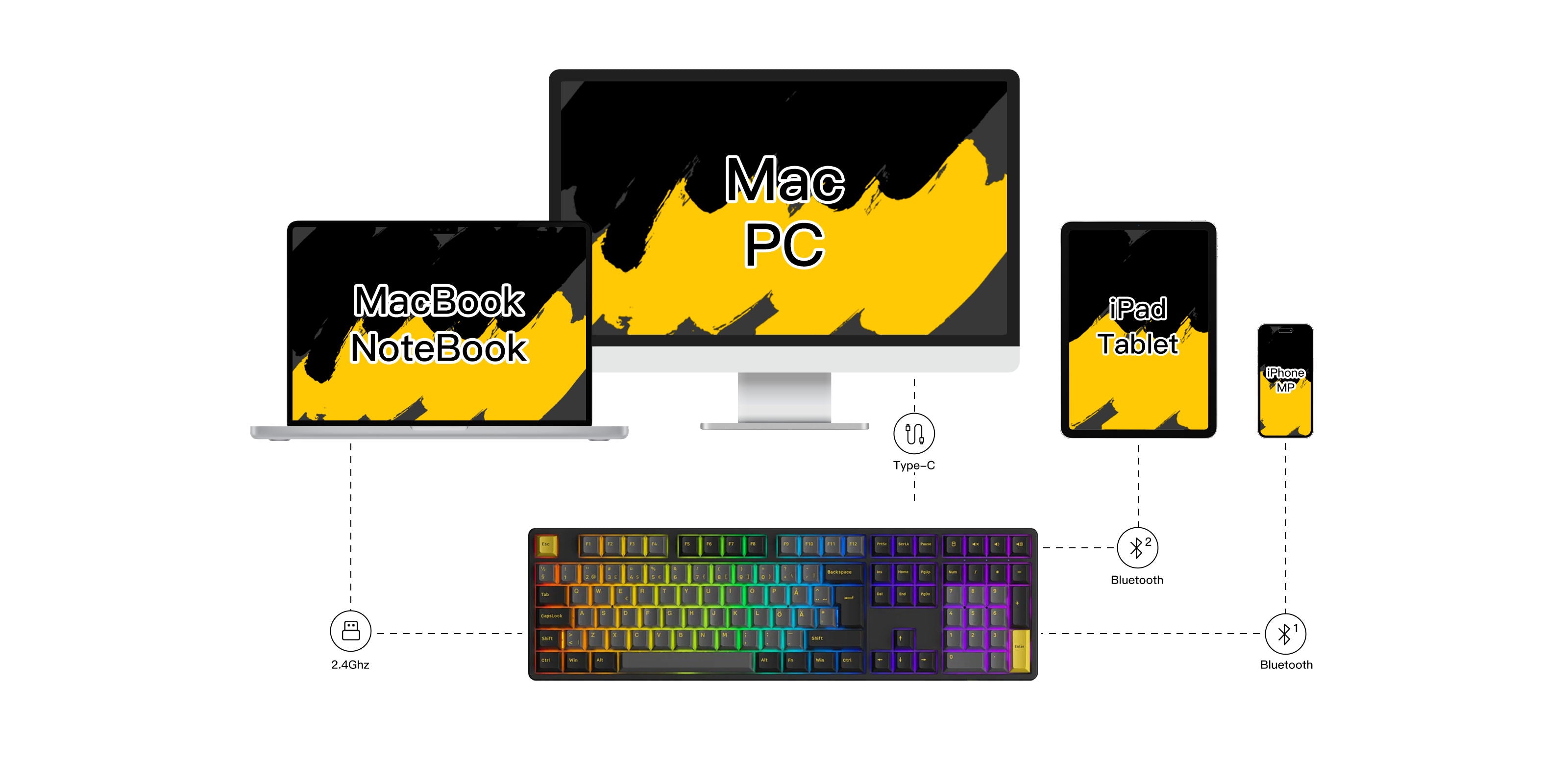 RGB LED Backlit + Hot-swappable + Bluetooth 5.0 + 2.4G Wireless + Wired (USB-C Mode) All in One!