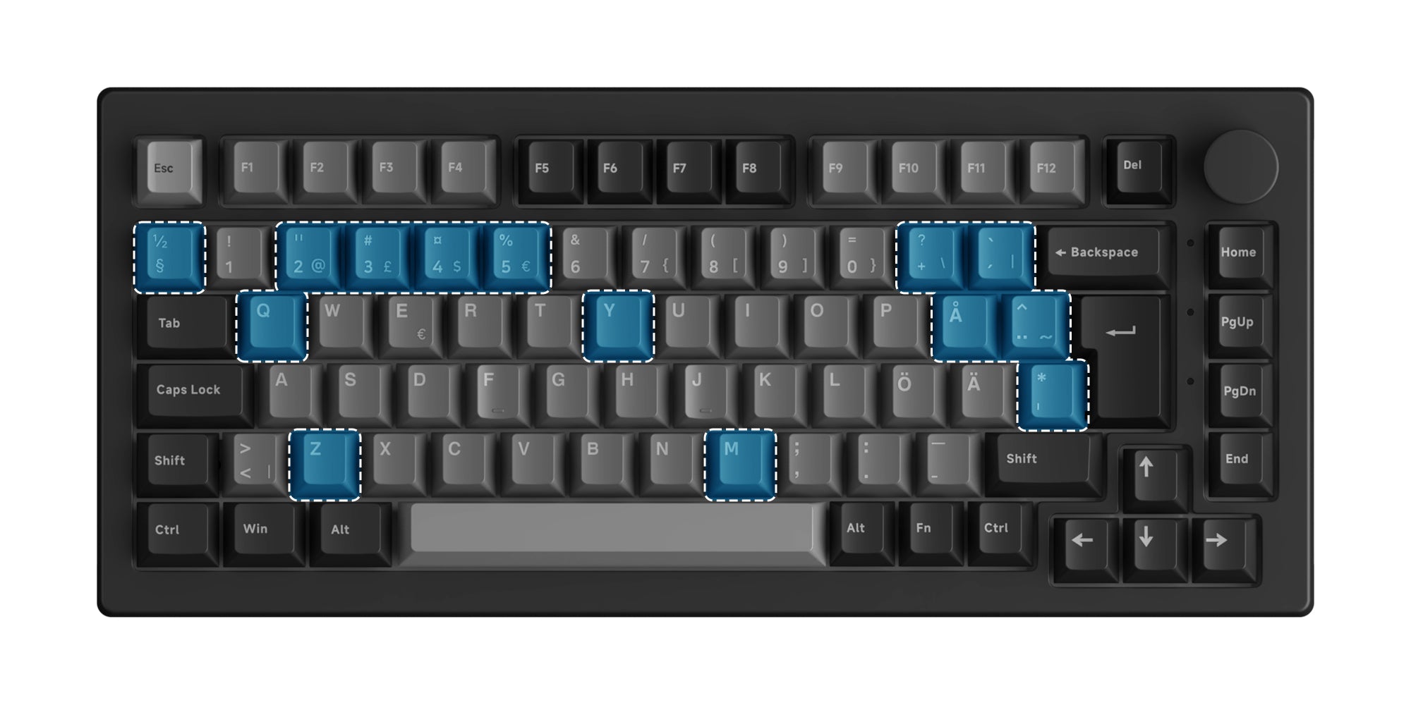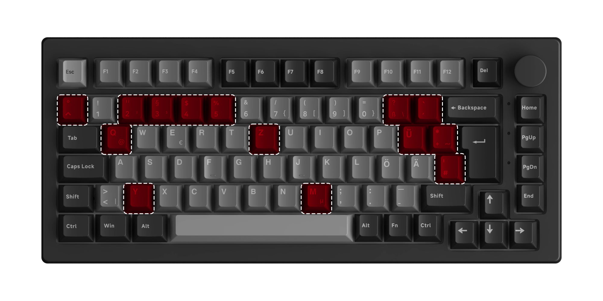 1. Remove the highlighted keycaps from your keyboard according to the picture above, using the provided keycap puller.