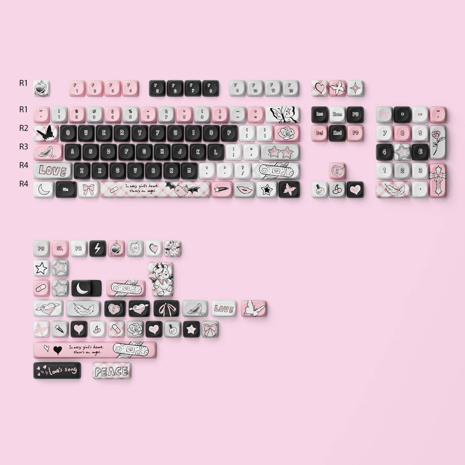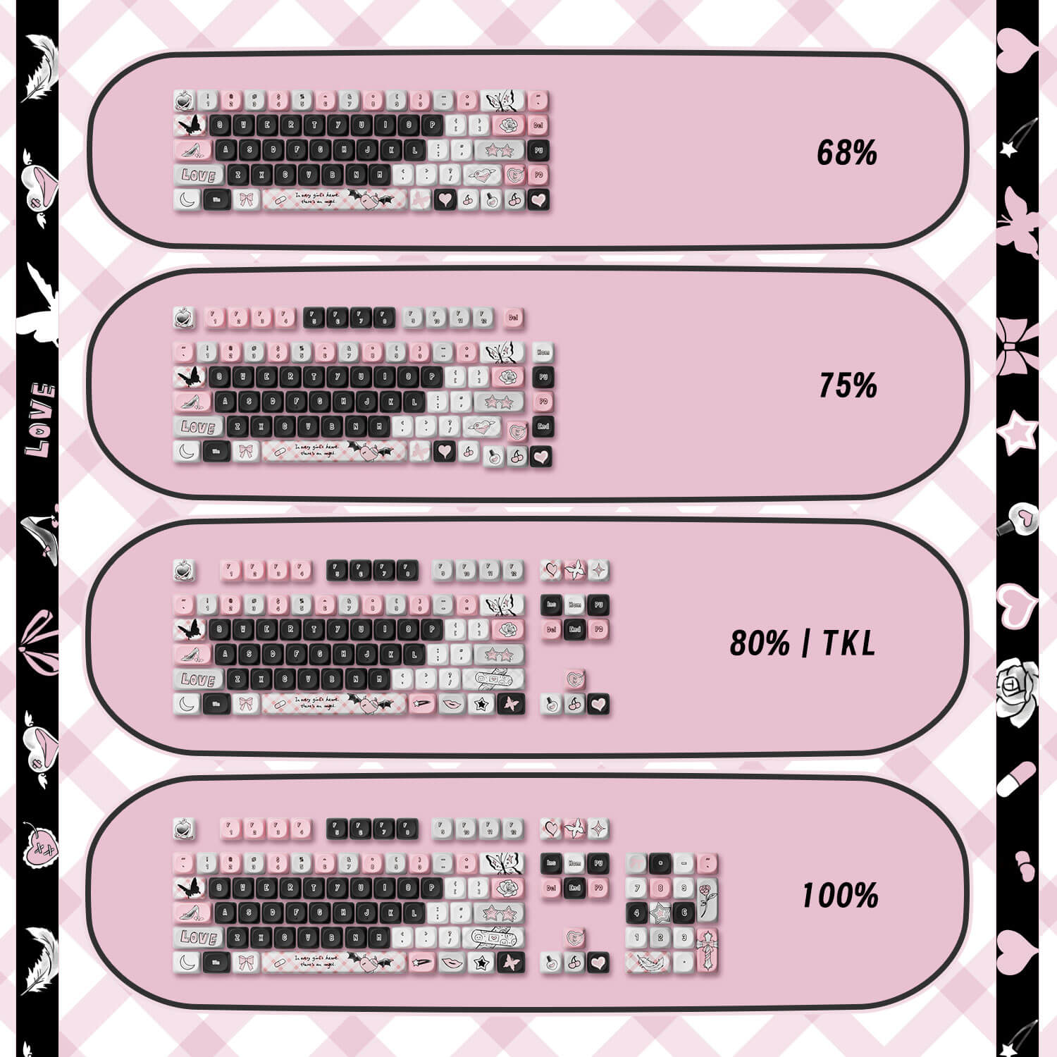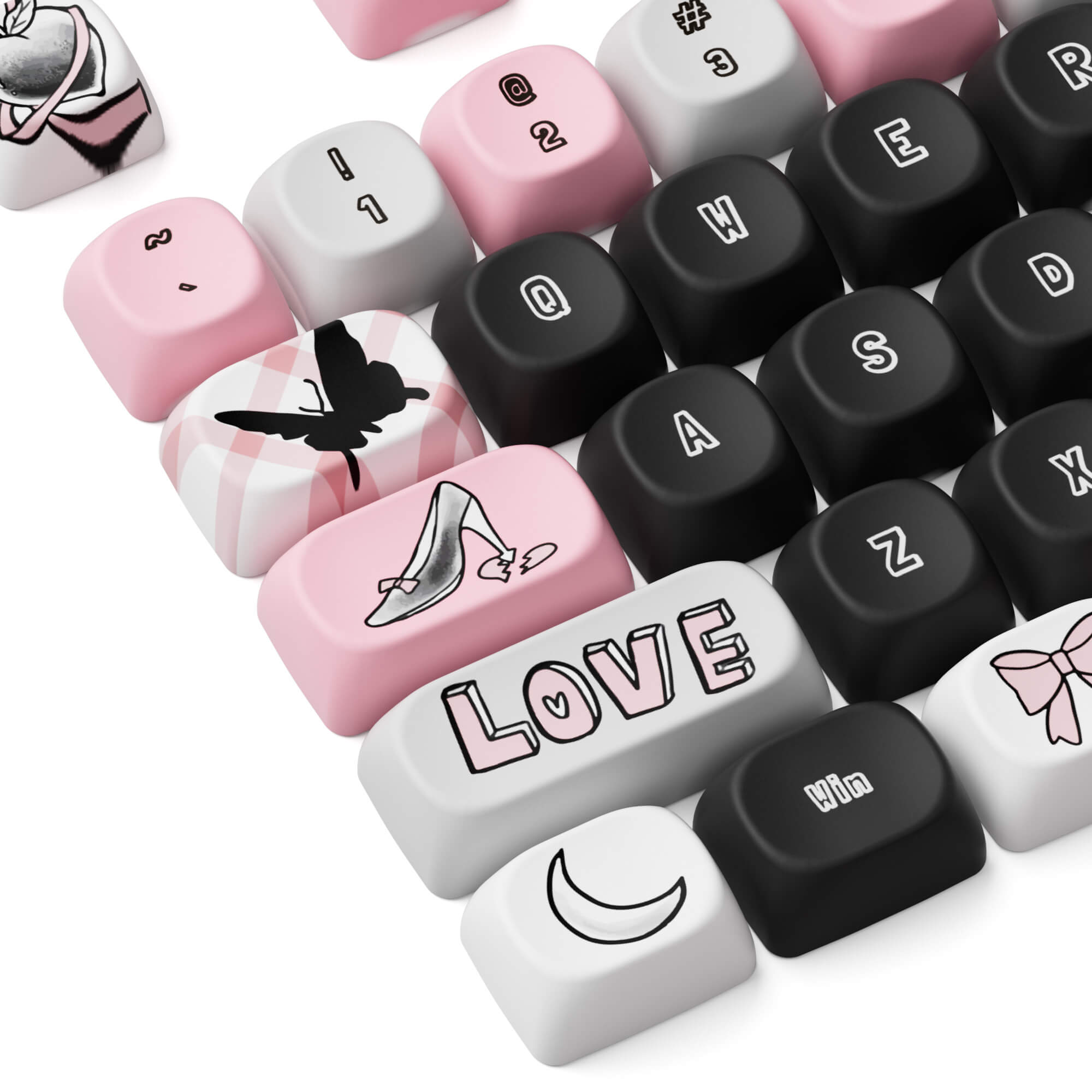 With its eye-catching black and pink motif, this keycap set gives your keyboard a chic and enigmatic look. PBT keycaps are a great option for people who like style and quality in their setup because they are made to be both aesthetically pleasing and long-lasting.