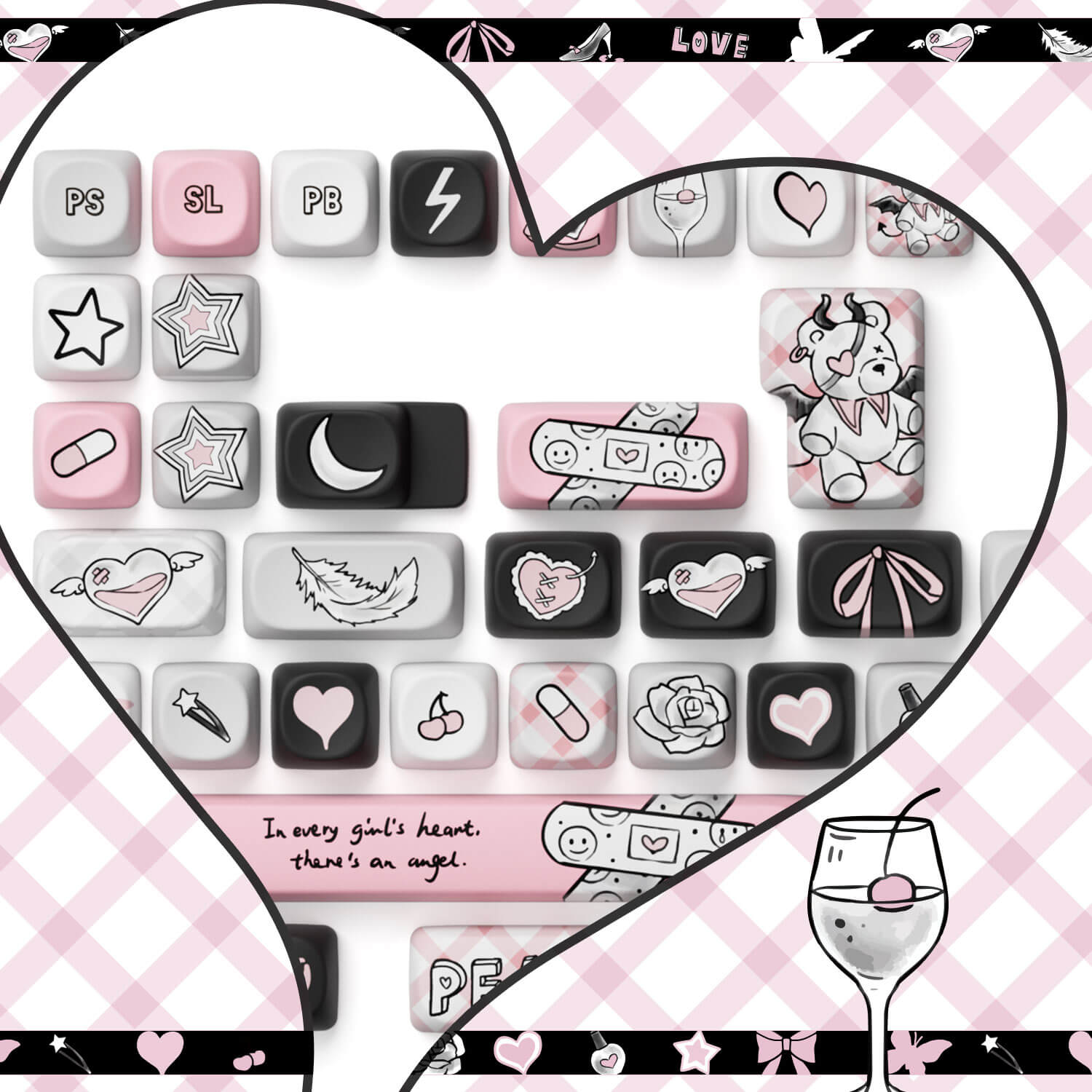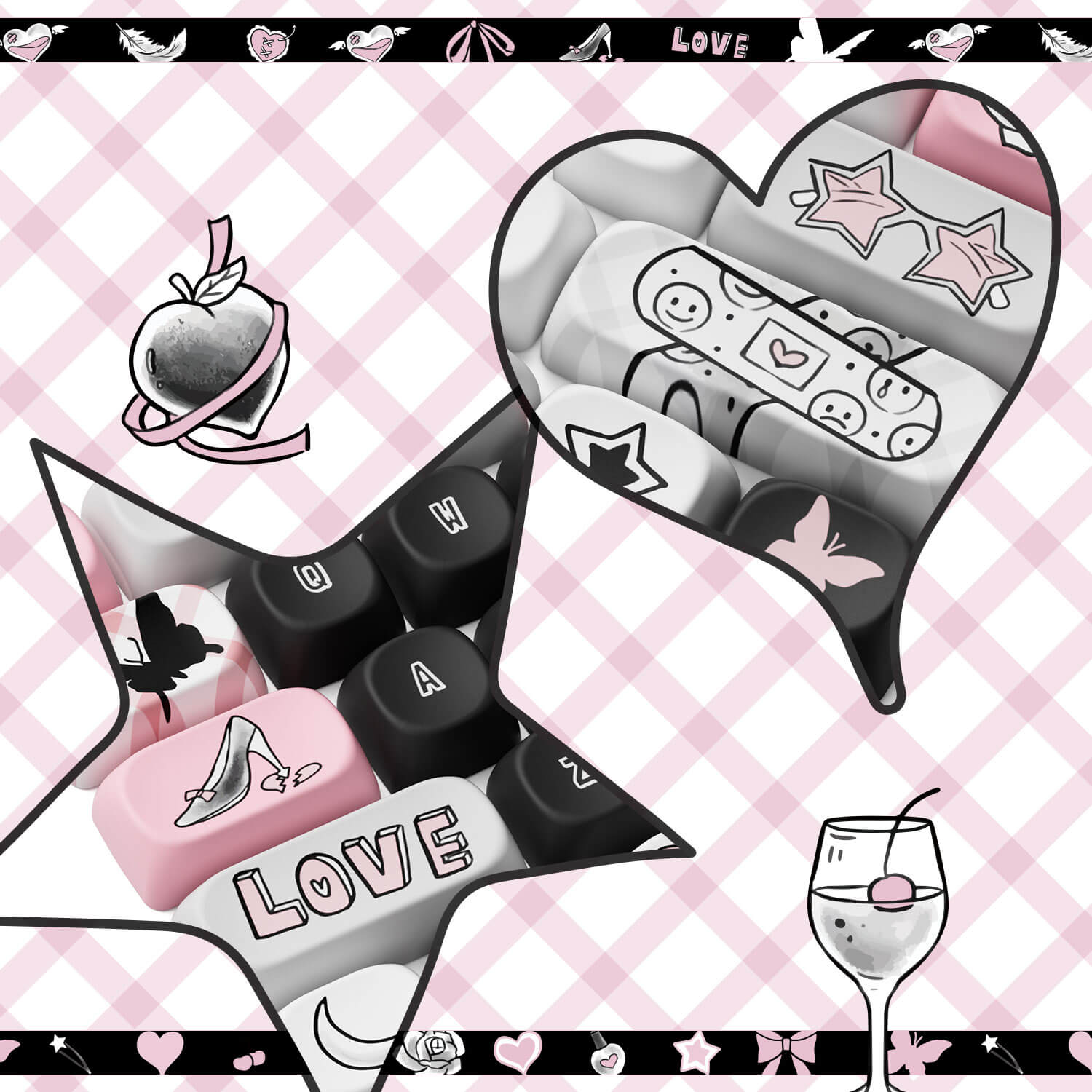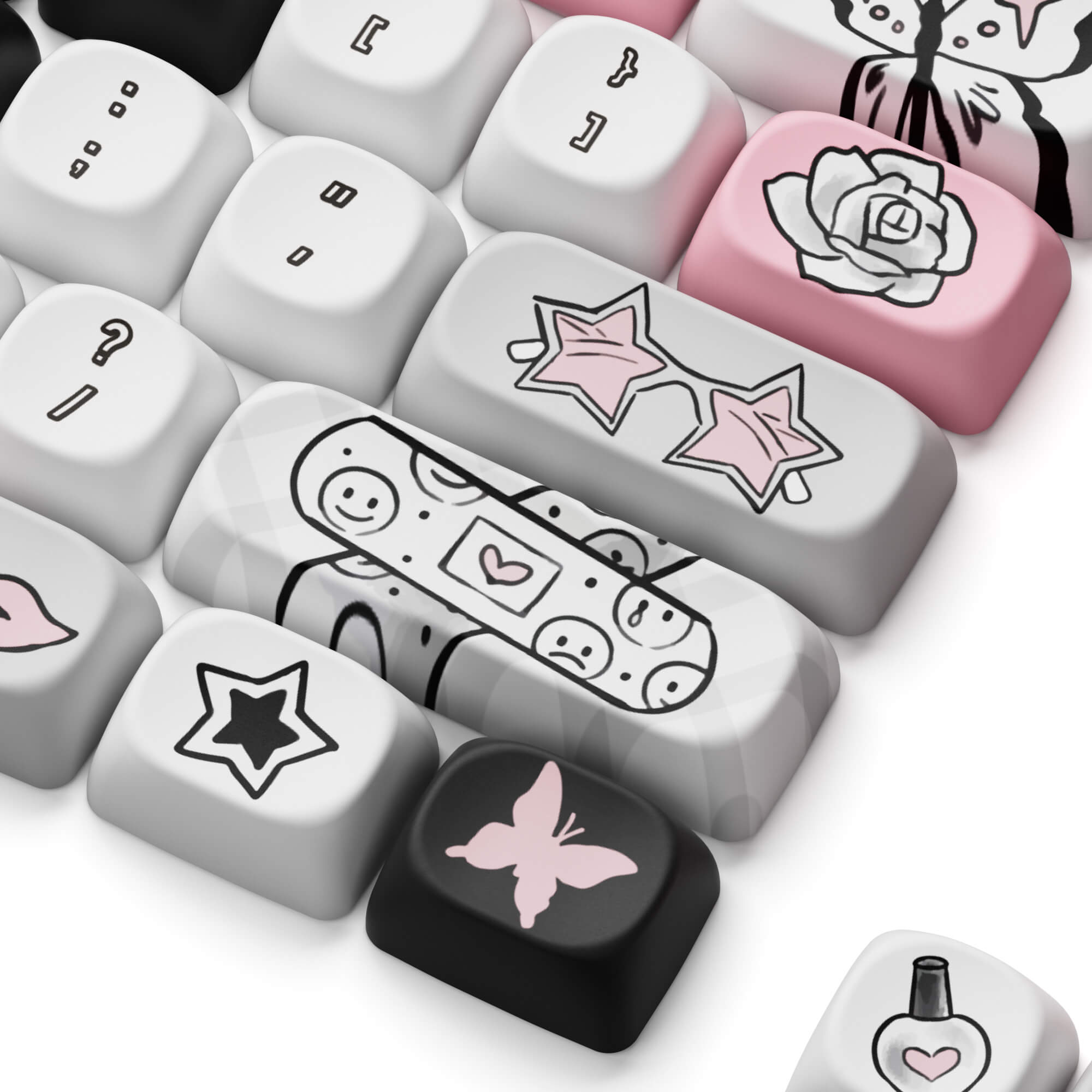 With its eye-catching black and pink motif, this keycap set gives your keyboard a chic and enigmatic look. PBT keycaps are a great option for people who like style and quality in their setup because they are made to be both aesthetically pleasing and long-lasting.