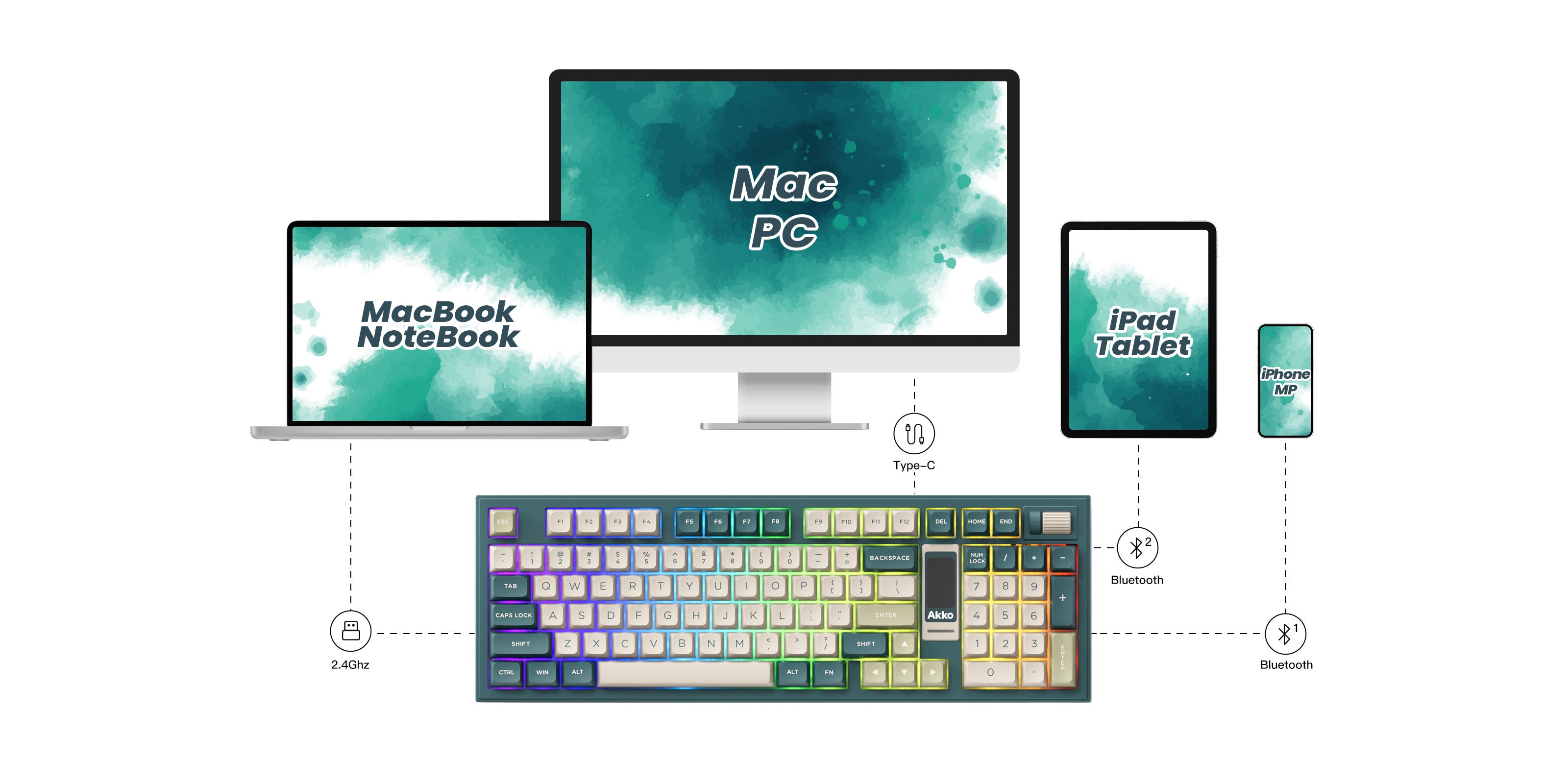 Ink Green 5098Bcan be connected to multiple devices through bluetooth 5.0, multi-host 2.4Ghz (with a receiver), and wired Type-C modes with easy switch.