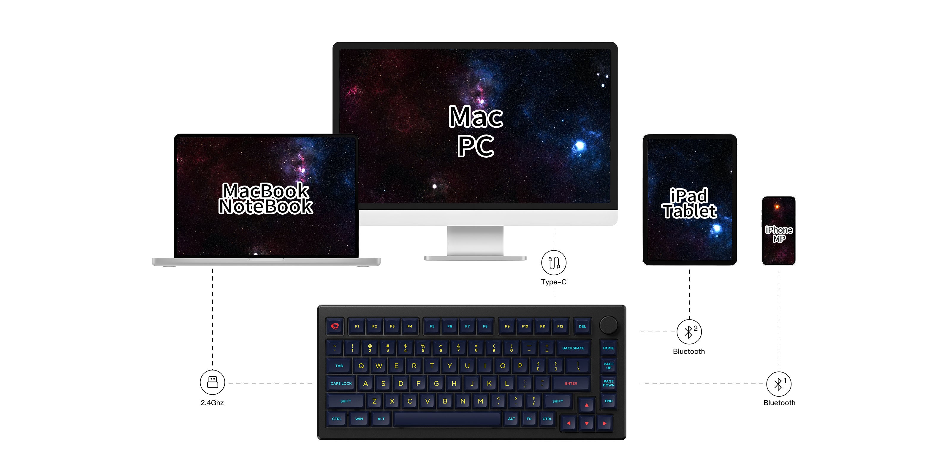 MOD 007B HE can be connected to multiple devices through bluetooth 5.0, multi-host 2.4Ghz (with a receiver), and wired Type-C modes with easy switch.
