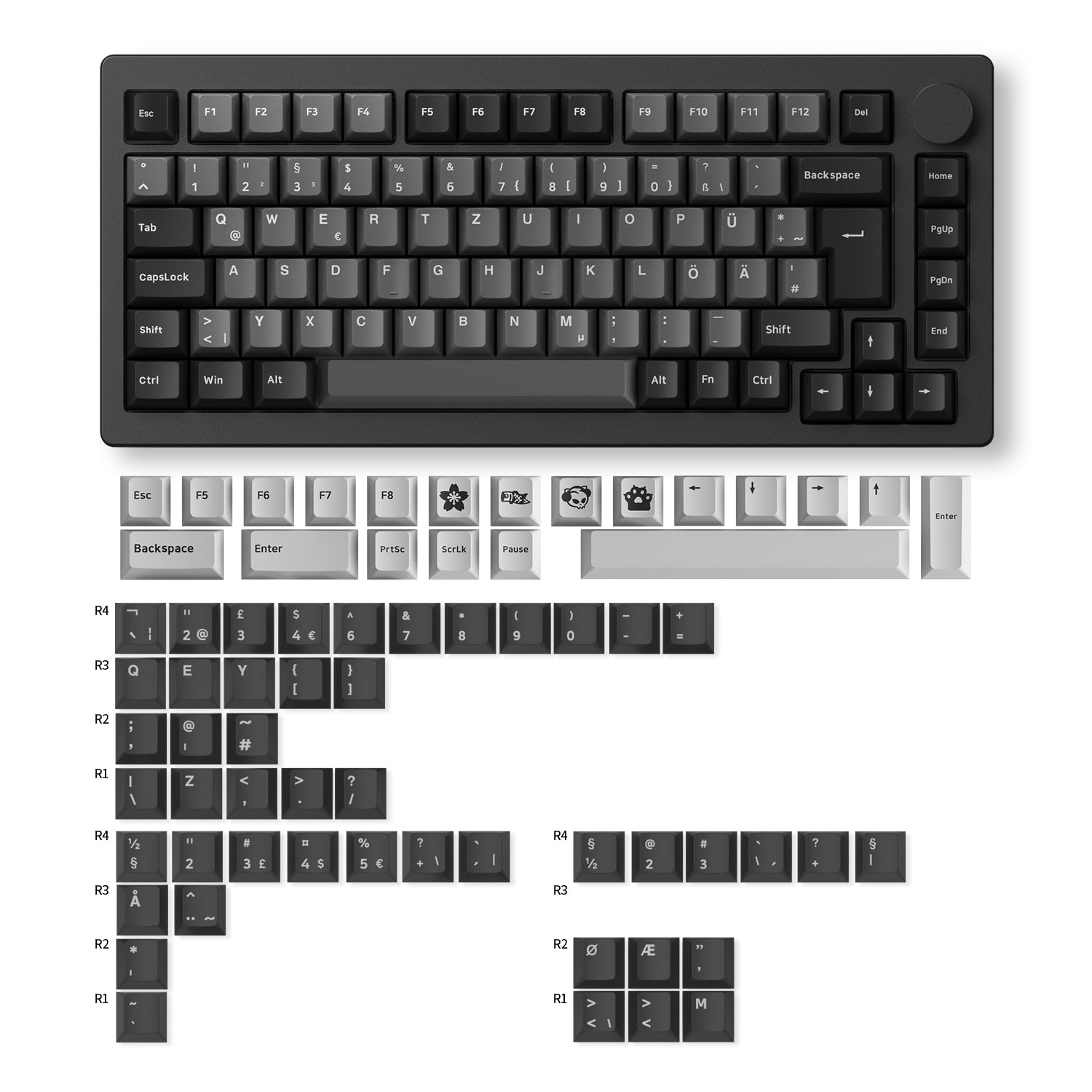 Black & Silver comes with ISO-DE pre-build keyboard, ISO-Nordic and ISO-UK extra keycaps. It does not support "Side-printed" or "Shine-through".