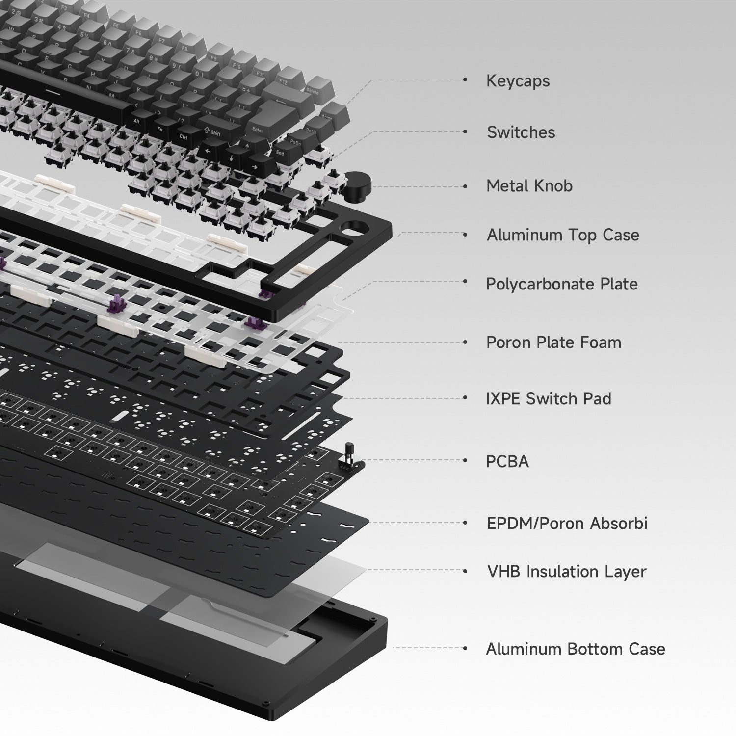 MonsGeek M1W V3 SP is equipped with PORON plate foam, effectively reducing the noise generated by key switches, ensuring a purer and more comfortable tactile sound experience for the keyboard.