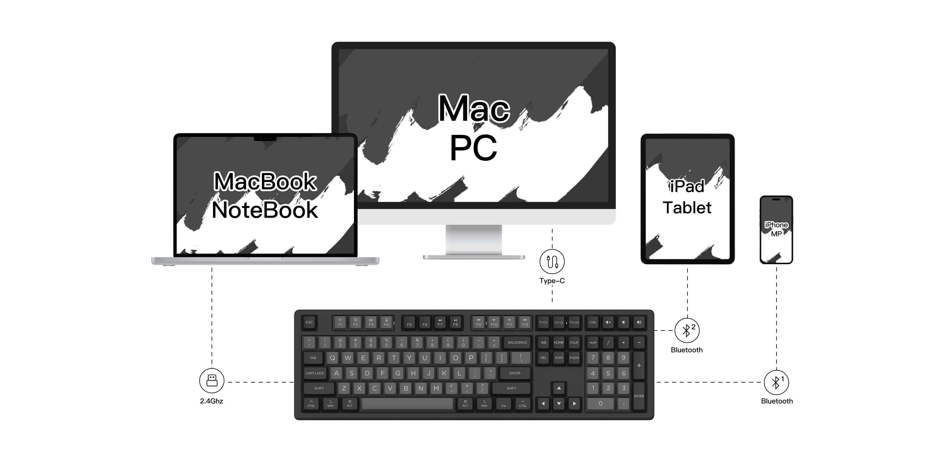 The MX108 Wireless Keyboard is designed for versatility, allowing seamless connections with a wide range of devices, including iPads, tablets, phones, computers, and laptops. Easily switch between Mac and Windows systems by pressing Fn + O, ensuring compatibility with your preferred operating system.