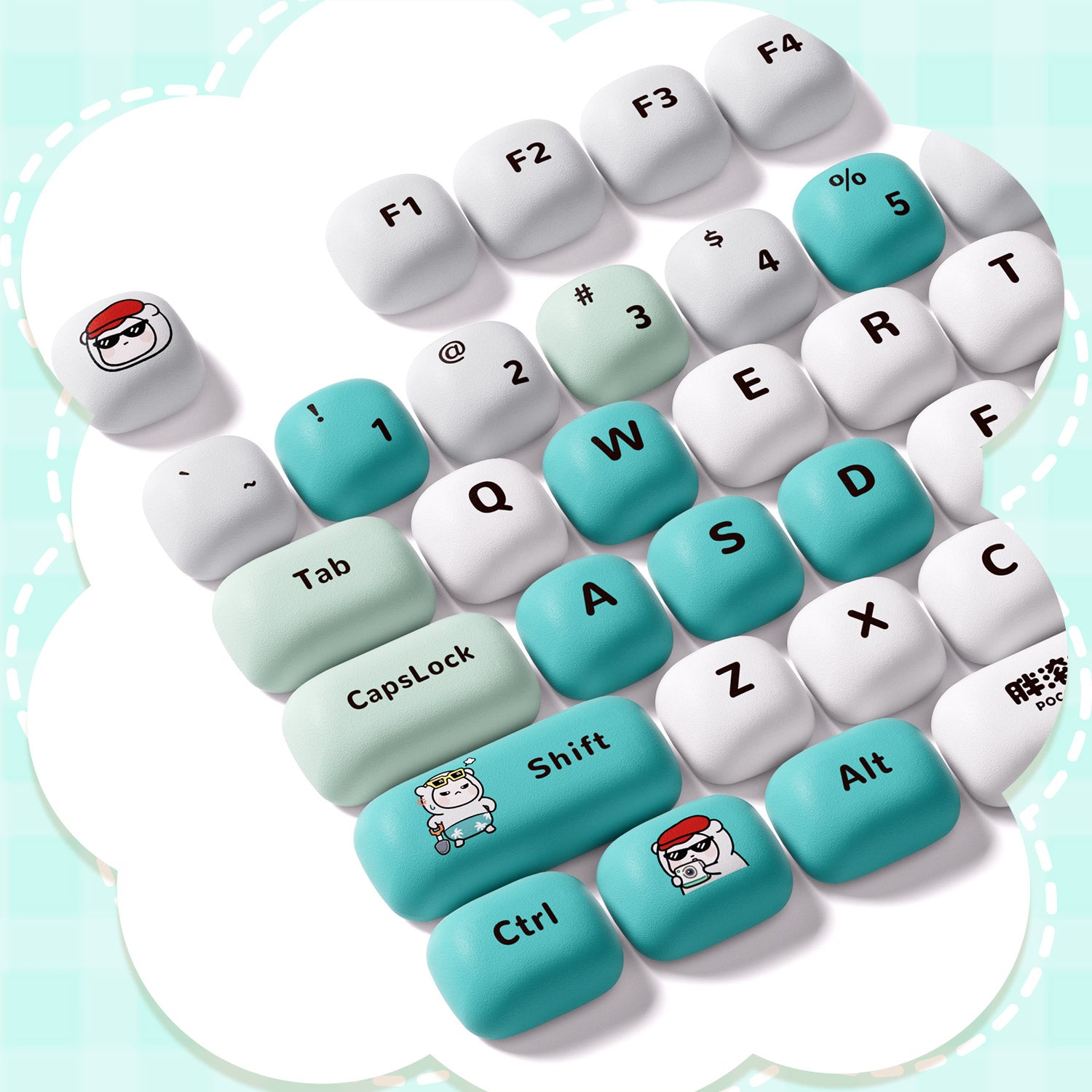 Embrace a cool and cuddly aesthetic with the POCO Family - POCO Bear Keycap Set. This 129-key set features POCO the bear and friends in a refreshing blue-and-white palette, perfect for those who love playful characters and a clean, cheerful desk setup.