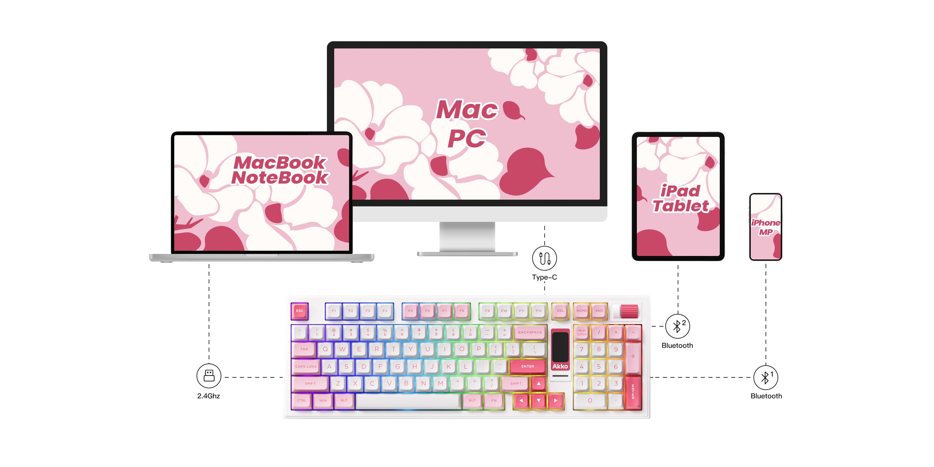 Prunus Lannesiana 5098Bcan be connected to multiple devices through bluetooth 5.0, multi-host 2.4Ghz (with a receiver), and wired Type-C modes with easy switch.