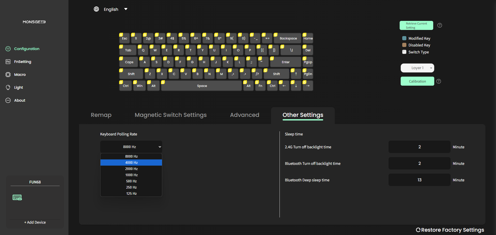 For FUN68 Wireless Version (Tri-Mode), supports 8000Hz polling rate for all keys in wired or 2.4G wireless modes.