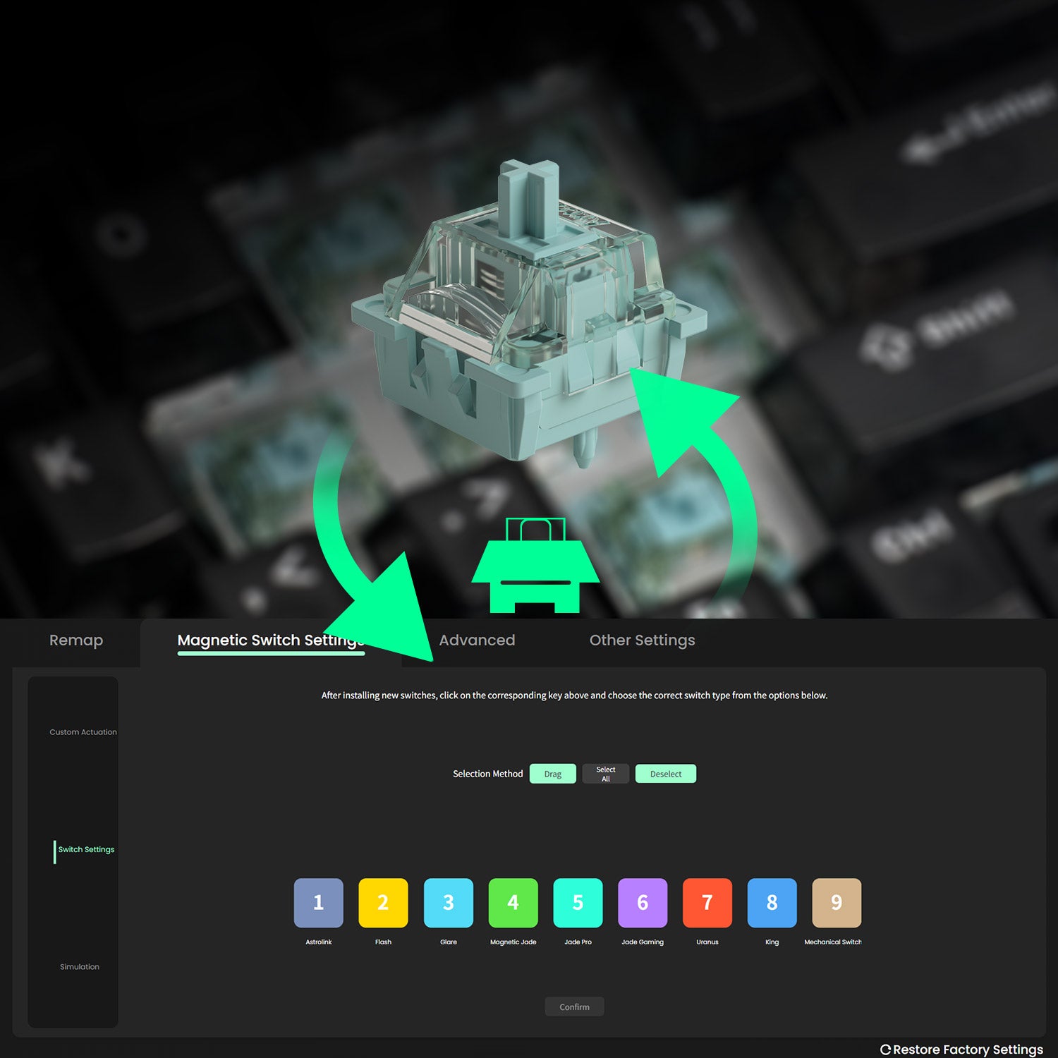 The FUN68 provides compatibility with 5 third-party magnetic switches: Akko Windy/Glare/AstroAim/Astrolink, Gateron Jade, Gateron Jade Pro, Gateron Jade Gaming, TTC Uranus and TTC King.