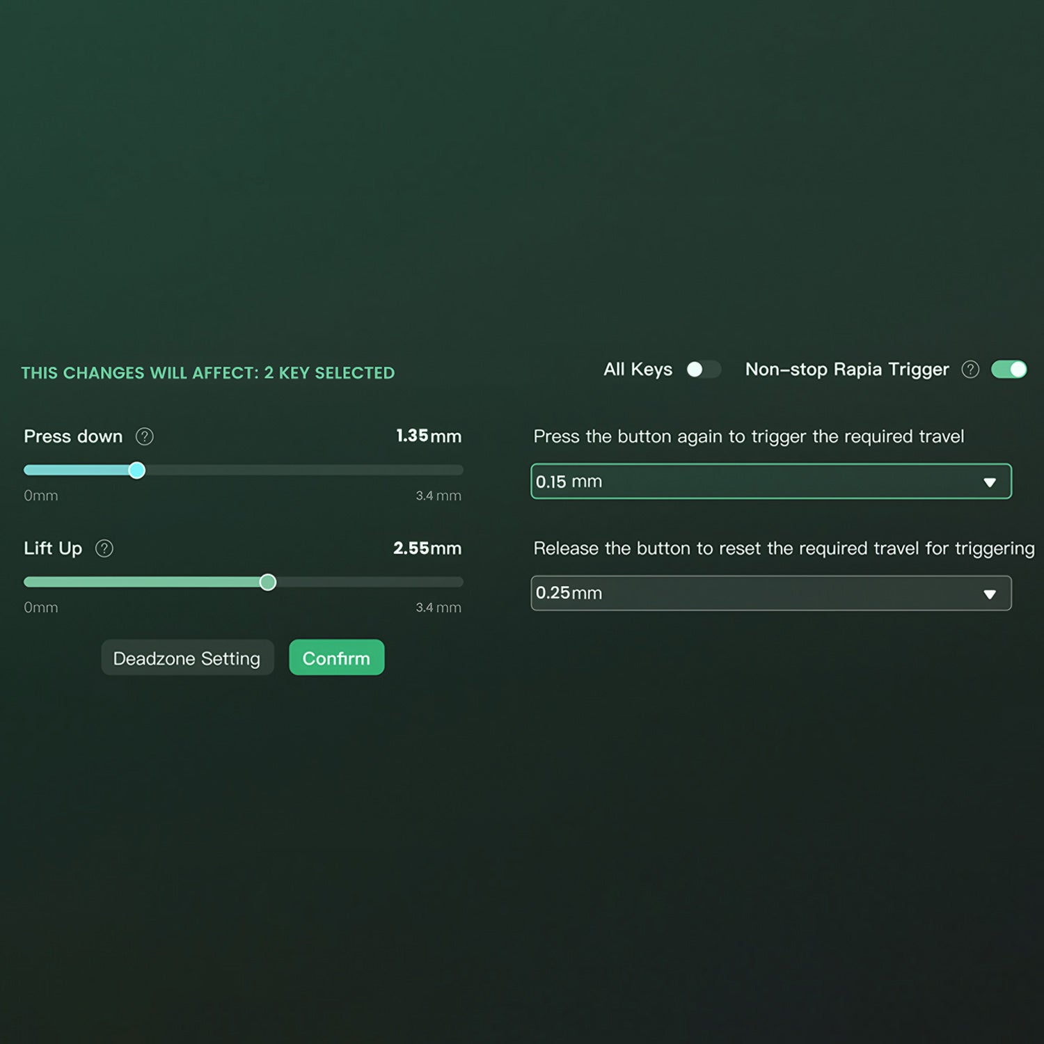 Depending on your keypress force: a light press triggers action 1, a deeper press activates action 2, and releasing the key also supports a two-stage key setting.