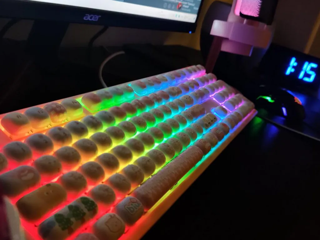 MG108B Piggy Party is a mechanical keyboard that combines whimsical design with advanced functionality. It features customizable RGB backlighting, hot-swappable sockets, and multi-mode connectivity options, making it ideal for both gamers and typists who appreciate style and versatility.